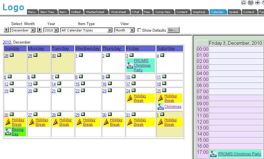 Month ViewThe Month View is shown in the screen image above. Clicking the link for an item name will display its details in the Item Detail Pane at the right. If you have appropriate rights, you can also edit or create items here. To create a new item, click the small icon to the right of the date in the appropriate cell.