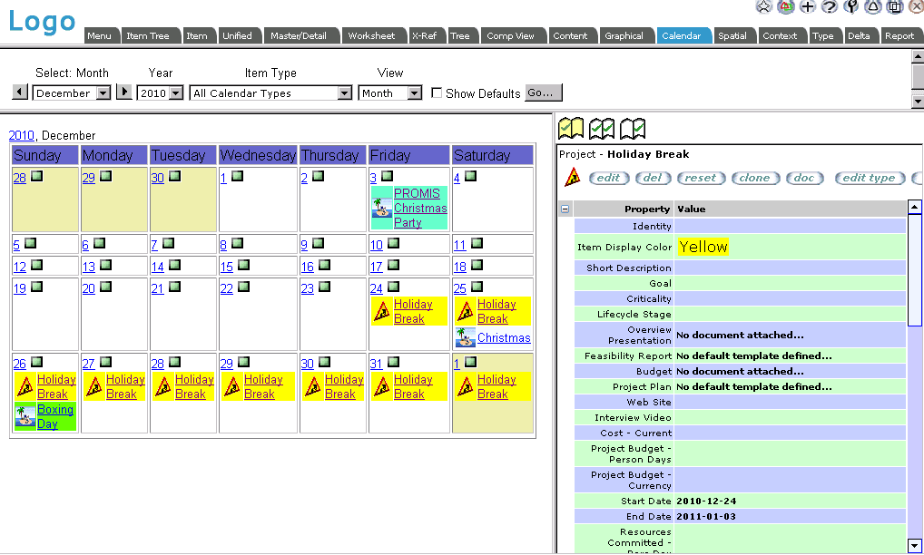 Clicking the year link above the calendar table will give you a year view for the year shown. Clicking the date link for a specific day will display a Day View in the right hand pane. Clicking the link for an item name will display its details in the Item Details Pane at the right. If you have appropriate rights, you can also edit the selected items here. Clicking the button next to the day number will enable you to create a new calendar item in the Item Details Pane. Each month is shown on a row of the display. Clicking the month name link on the left of the row will display a Month View for the selected month. Clicking the date link of a cell will display a Day View for that day, as shown in the right hand pane above. (Items with no designated time will appear at the top; Items with designated times will appear at their designated time slots. ) Day ViewThe Day View appears in the right hand pane when a specific date is selected in the left pane of either the Year or Month Views. It displays time related items present on that day. See the example below. Items with no designated time will appear at the top; Items with designated times will appear at their designated time slots. Unknown DatesEVA Netmodeler provides a feature for handling unknown dates. This is very useful, for example, when we are scheduling tasks within a project. We may not know yet on which date a task will commence or finish. Many systems will force you to enter a valid date, even if you do not know one - this leads to inaccurate data and confusion. In EVA Netmodeler, putting a blank or illegal value in a date property will result in it showing up as UNKNOWN. The calendar browser supports finding items with UNKNOWN dates (start or end). These views are available as selections in the "View" dropdown.
