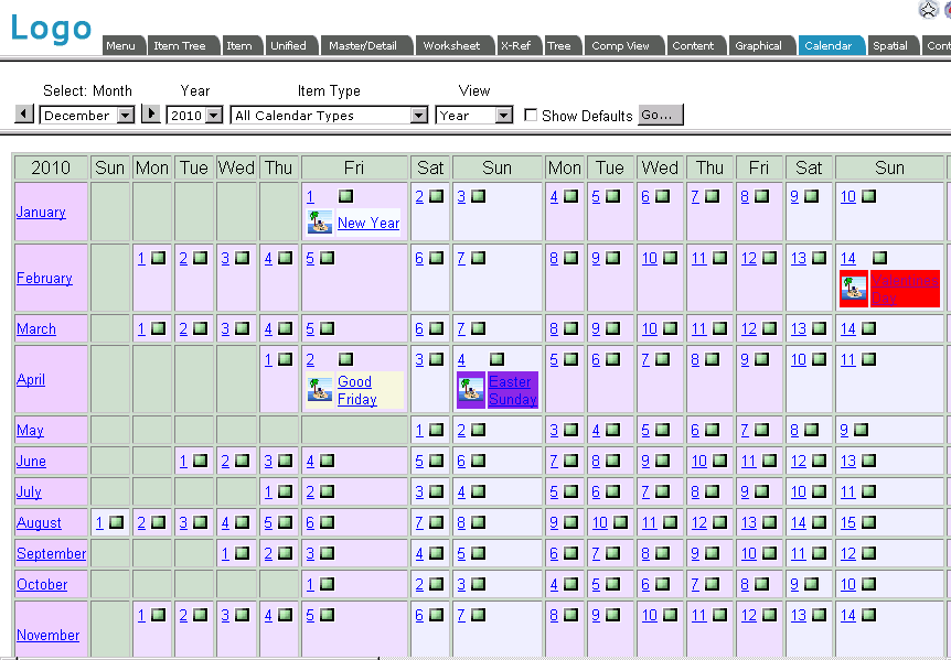 Clicking the month link in the left hand column of the calendar table will give you a Month view for the year shown. Clicking the date link for a specific day will display a Day View in the right hand pane. Clicking the link for an item name will display its details in the Item Details Pane at the right. If you have appropriate rights, you can also edit the selected items here. Clicking the button next to the day number will enable you to create a new calendar item in the Item Details Pane.