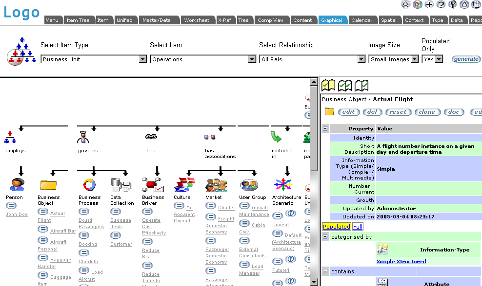 This browser allows display and navigation of items and their relationships in a graphical mode. You can select the type and the item to begin with and then see either all relationship types or selected relationships. If a