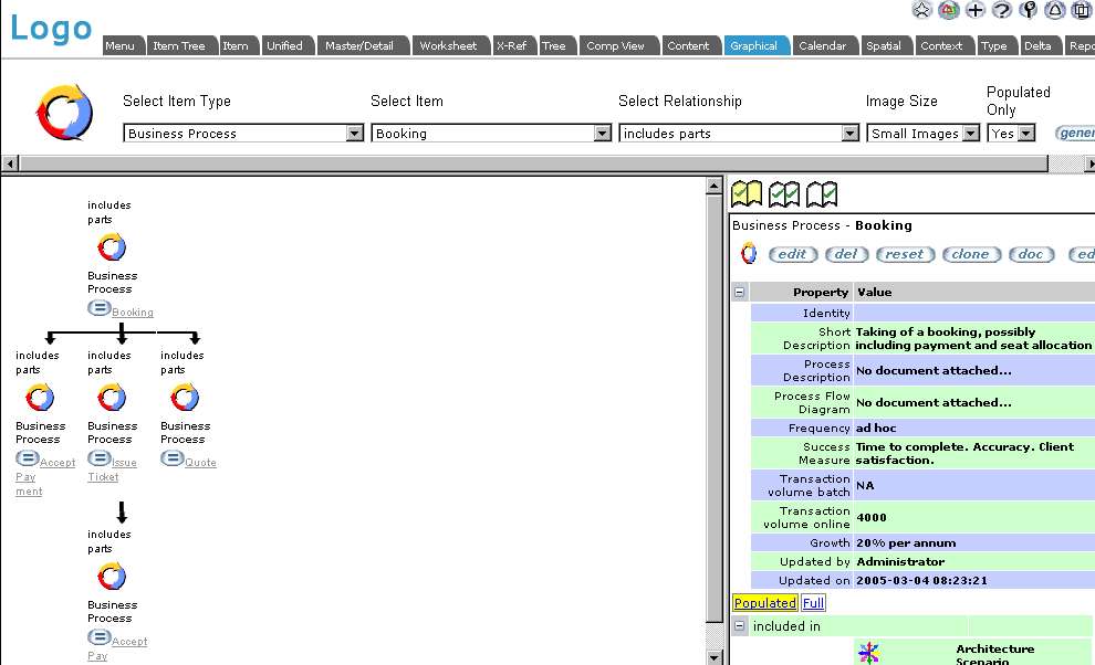 relationship type. Note that any type of item related via the selected relationship type will also be included in the display. In this example Business Process also includes parts Process Activity Quote-1a.