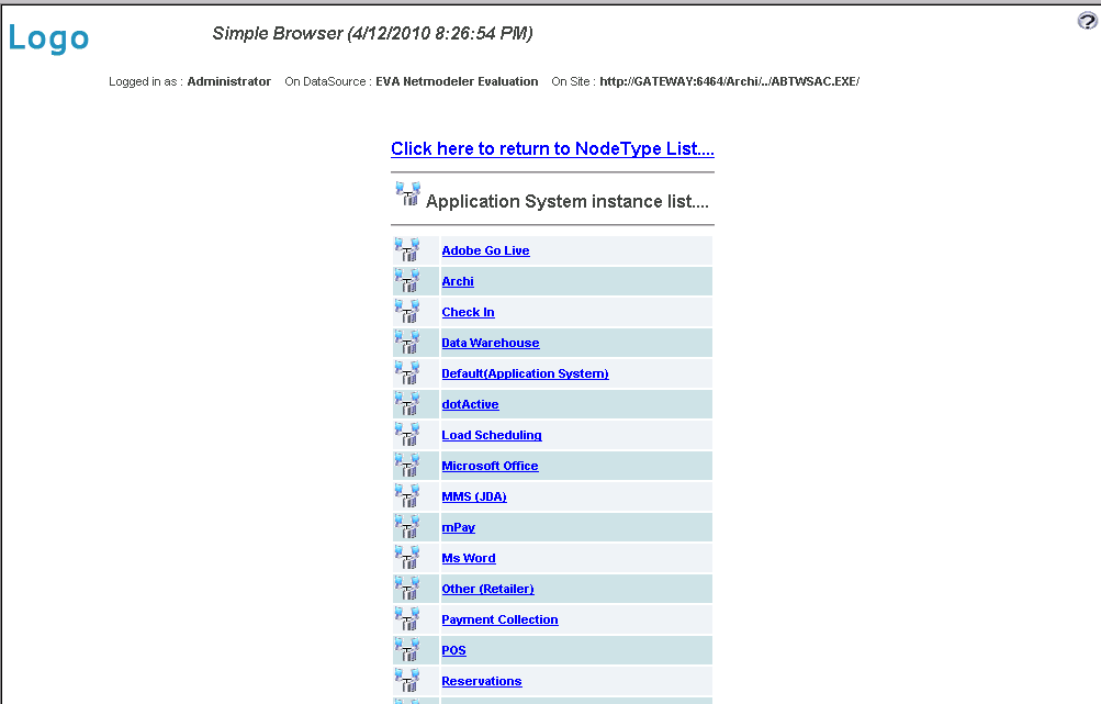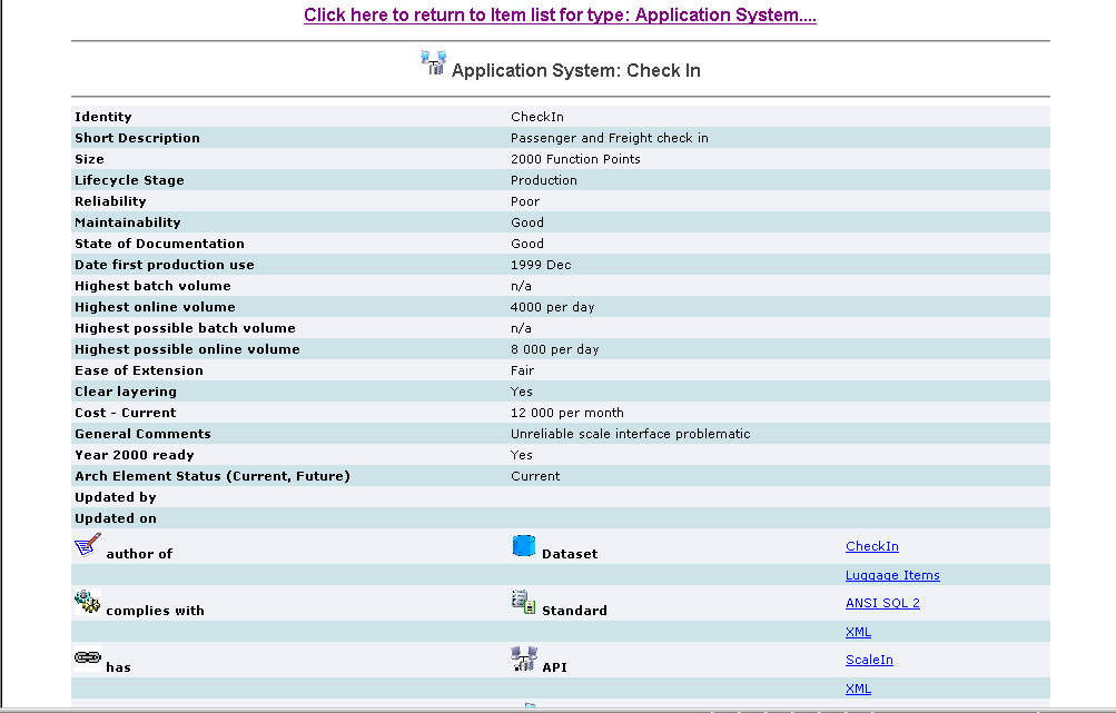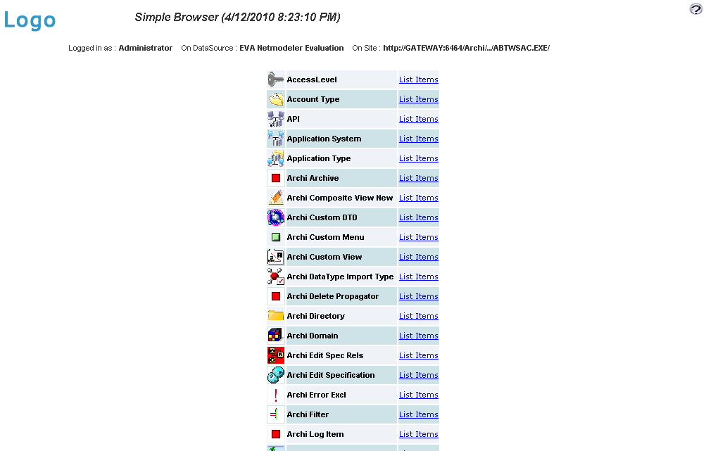 Simple browser is provided as a custom view. It can usually be accessed from the Menu Browser, if made available. It provides a very simple but effective way for novice users to get basic information from the repository. It first presents a list of types accessible to the user. Once a type is selected, a list of instances is presented. Once an instance is selected, the user is presented with the properties and relationships relevant to the selected item. Relationships are navigable allowing the user to move to related items easily.