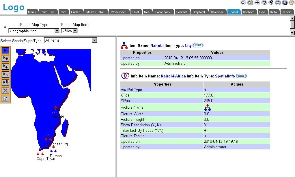 The Spatial browser provides a way of viewing information from the perspective of spatial models. These can reflect geographical maps, conceptual maps or topographical maps. A map has a background image and a variety of items