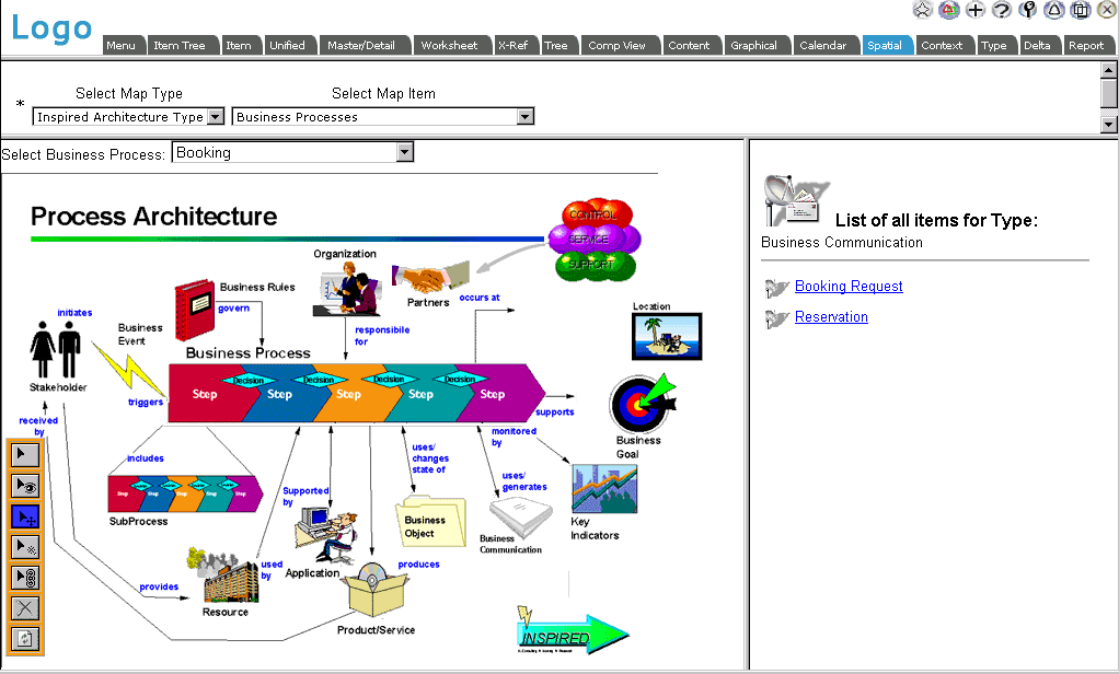 In this view we see the Process Architecture overview of the Inspired Architecture Framework. The Business Communication icon has been clicked, resulting in the list of Business Communication items in the right hand frame. Below