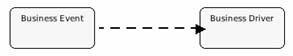 The table below provides some examples of how different Rel Symbol definitions are rendered in Archi Graphical Modeler. In all the examples, the Rel Symbol definition is used to link the "Business Event" node to the "Business Driver" node;